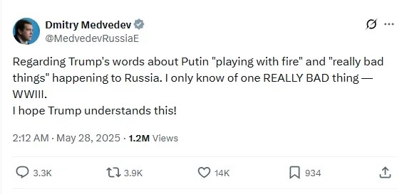 梅德韋傑夫在平台X上回應道:“關於特朗普說普京’玩火’和俄羅斯發生’真正糟糕的事情’。我只知道一件真正糟糕的事情——第三次世界大戰。”