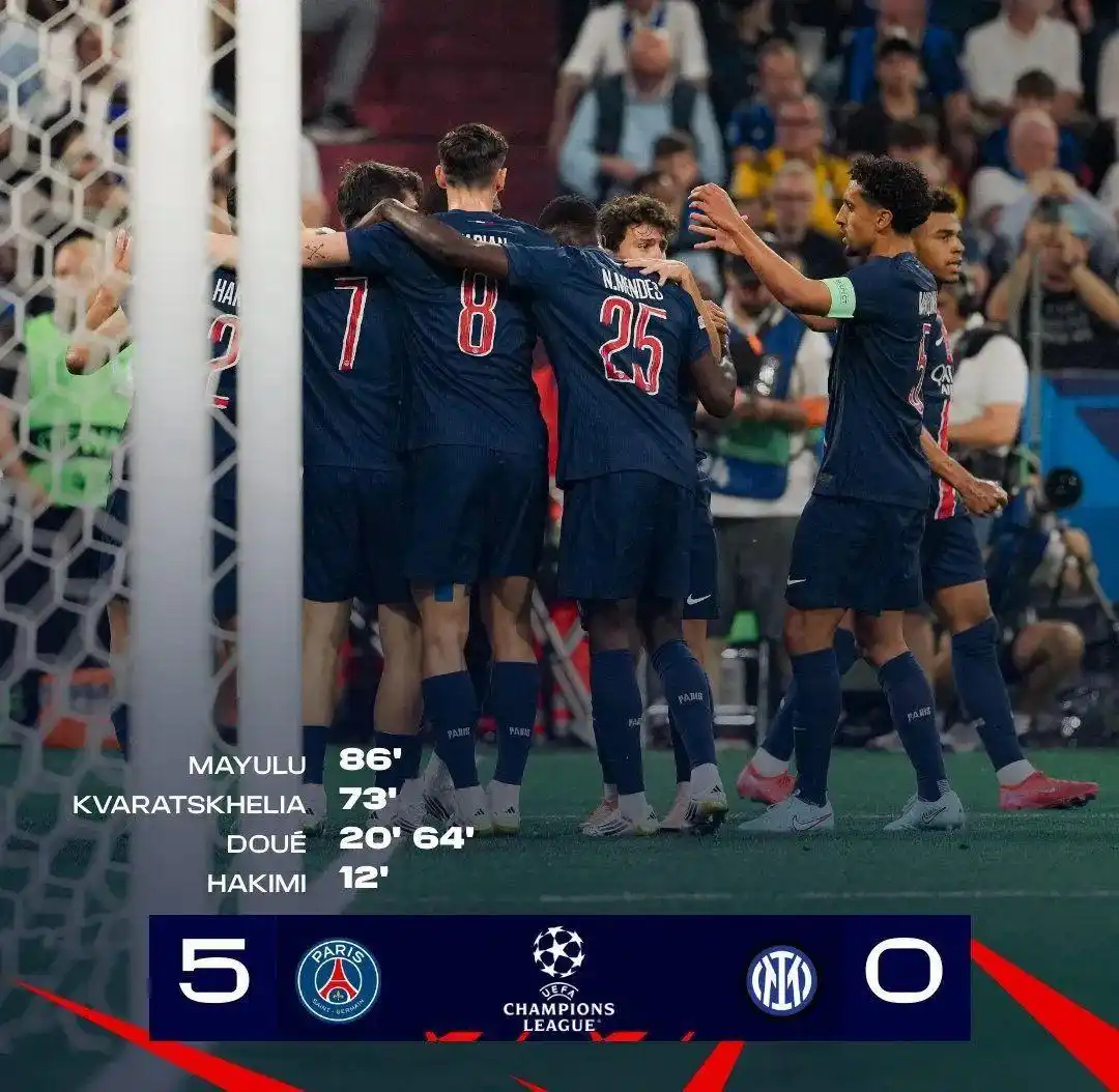 大巴黎得勢不饒人,第73分鐘,克瓦拉茨赫利亞射成4:0,第86分鐘,將比分定格在5:0 ! 這場一邊倒的賽事,創造了歐冠決賽的歷史最大比分!