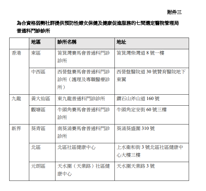 為照顧弱勢社群的預防及篩查需要,就綜合社會保障援助受助人或獲醫院管理局醫療費用全數豁免或部分減免的婦女,康健中心/站會安排她們到七間選定的醫院管理局普通科門診(見下圖),接受相同的預防性婦女保健及健康促進服務。