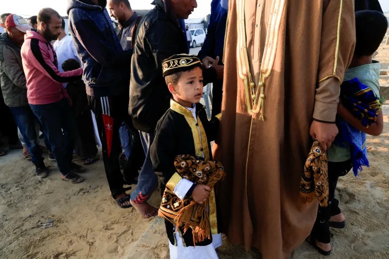 巴勒斯坦男子和男孩在加薩走廊南部的汗尤尼斯進行宰牲節祈禱(路透社)