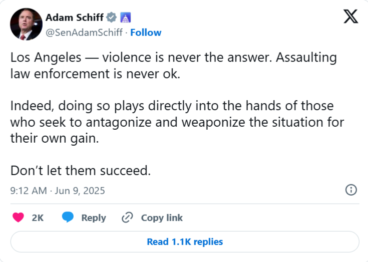 州長紐森和加州參議員亞當希夫已透過X平台敦促抗議者不要使用暴力。