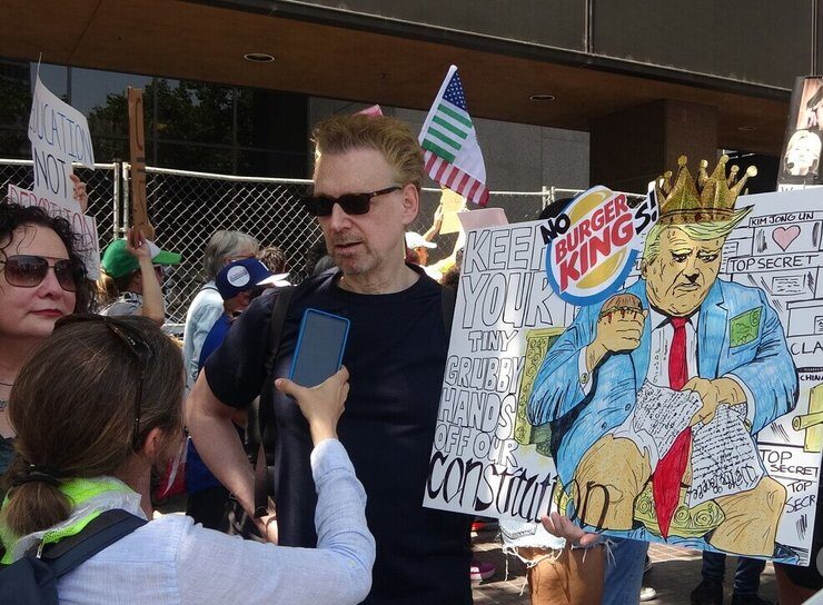 示威群眾喊口號「這就是民主的樣貌」、「抗議就是愛國」、「不要國王」、「不要ICE,這裡歡迎移民」,活動現場人們揮舞美國國旗及墨西哥、宏都拉斯等拉丁美洲國家國旗,為拉丁裔移民發聲。