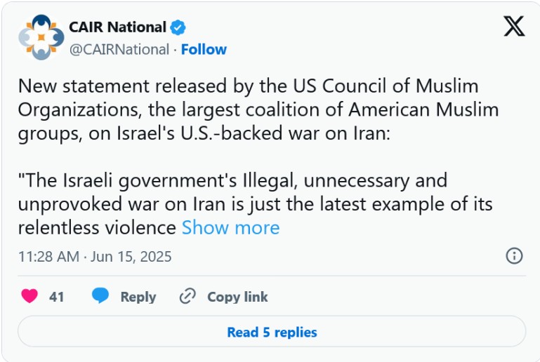 美國最大的穆斯林團體聯盟美國穆斯林組織委員會警告稱,以色列「對伊朗發動非法、不必要和無端的戰爭……有可能使美國陷入更多的死亡和破壞」。