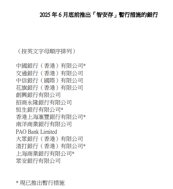 註:部分銀行在暫行階段只向65歲或以上客戶提供「智安存」,服務細節(如適用帳戶類別)亦可能有所不同,詳情請向個別銀行查詢。