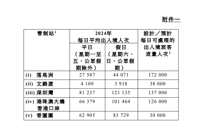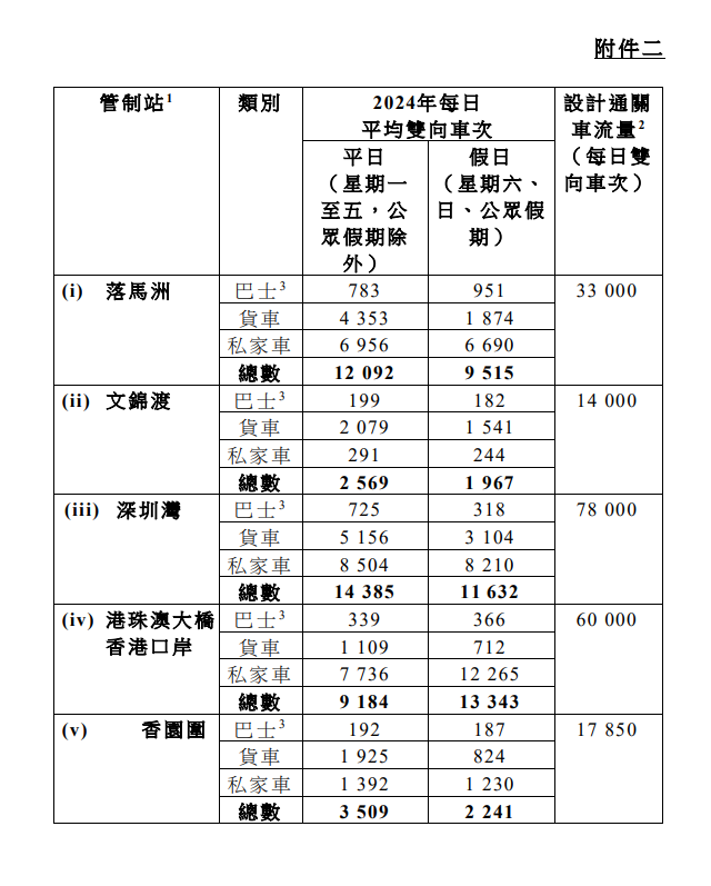 (一)各陸路邊境管制站的設計/預計每日可處理的出入境旅客流量,以及二○二四年每日平均出入境(雙向)人次載列於附件一;而各陸路邊境管制站的設計通關車流量,以及二○二四年每日平均雙向車次載列於附件二。