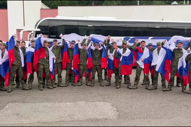 俄羅斯國防部於2025 年7 月4 日發布的影片顯示,在白俄羅斯一個秘密地點交換戰俘後,俄羅斯戰俘與俄羅斯國旗合影(法國媒體)