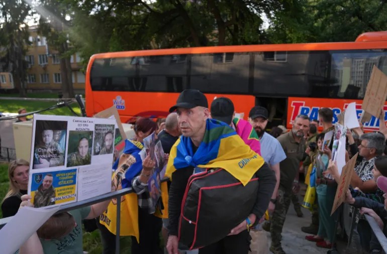 烏克蘭人迎接被俄羅斯釋放歸來的戰俘(歐洲通訊社)