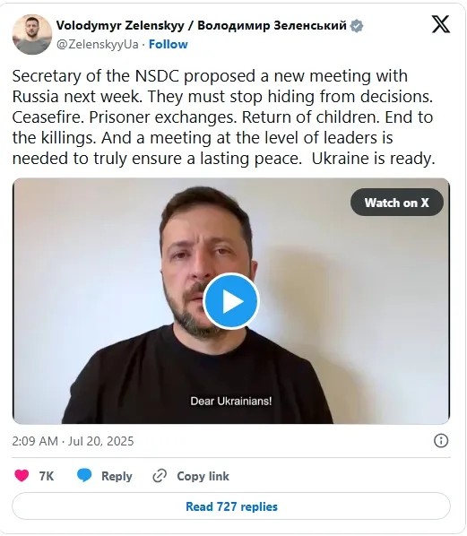 澤倫斯基表示烏克蘭已向俄羅斯提出新一輪和平談判的提議