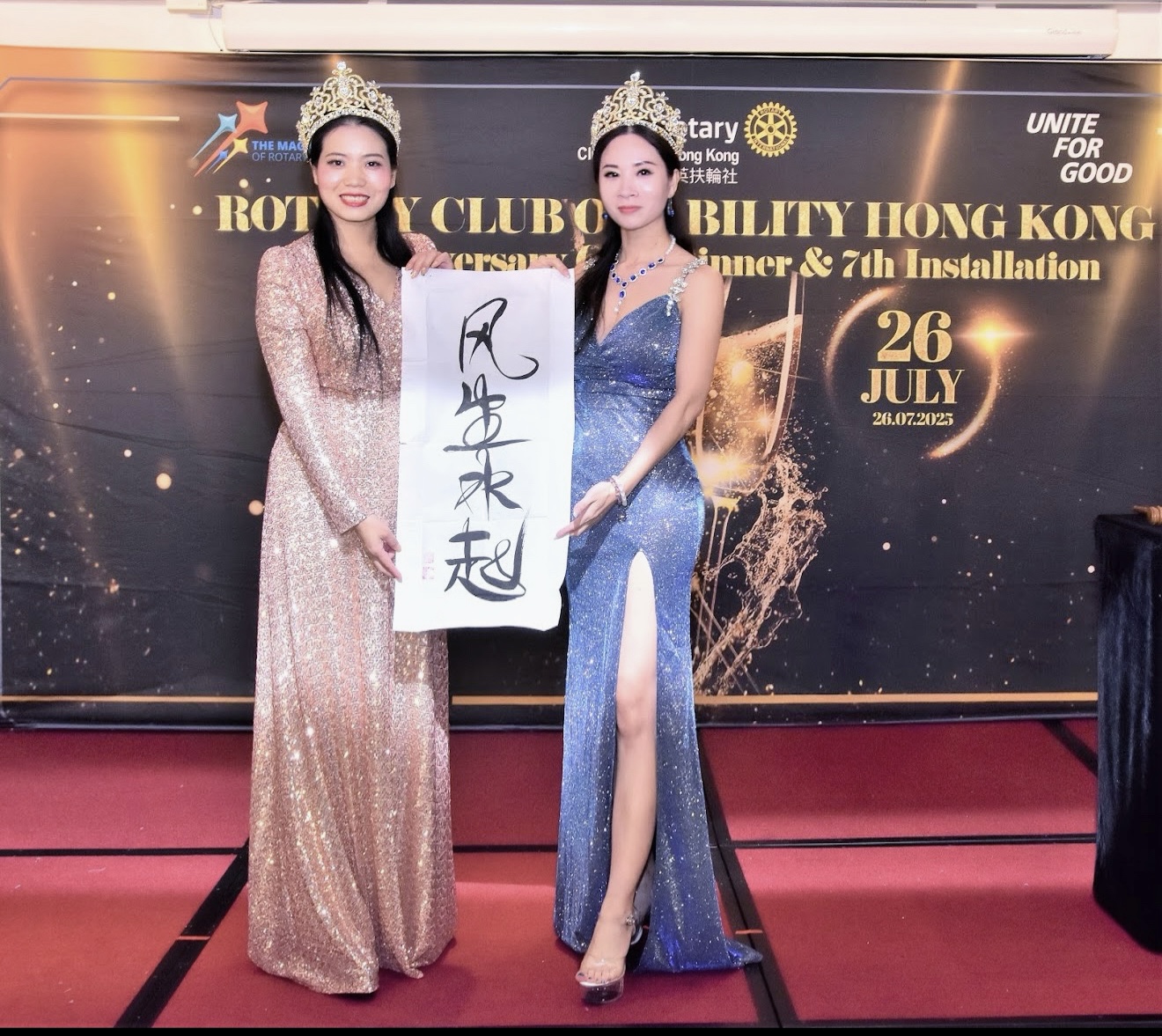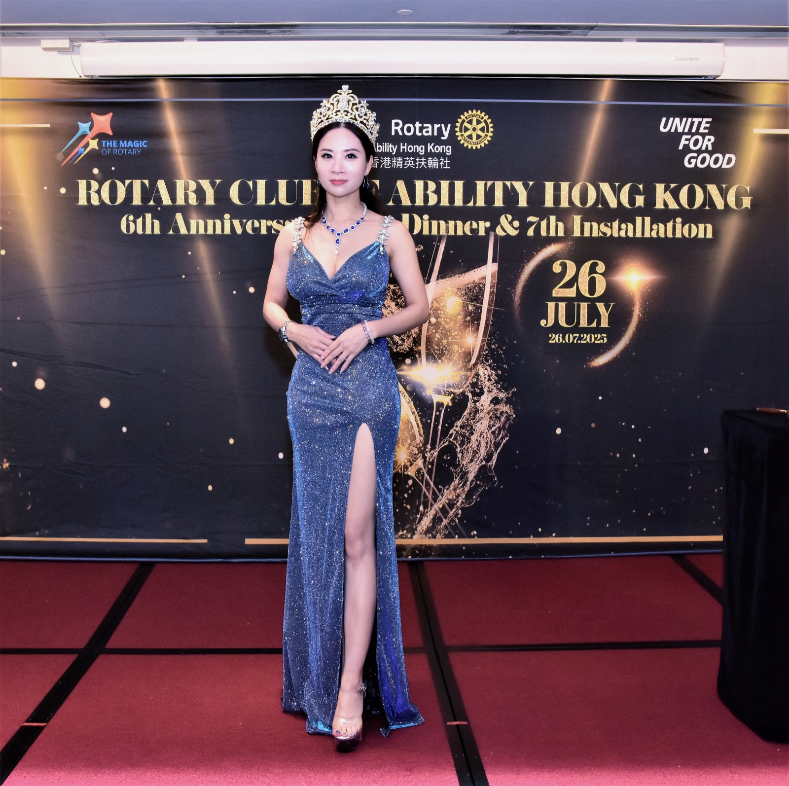 (中華新聞通訊社/中華時報7月28日訊)第29屆香港環球夫人大賽冠軍蘇妙佳(Bowie So)近日亮相香港精英扶輪社周年晚宴,以籌款嘉賓身份積極推動慈善募捐,現場慷慨捐出現金獎券支持公益專案,展現“美愛同行”的環球夫人精神,贏得全場讚譽。