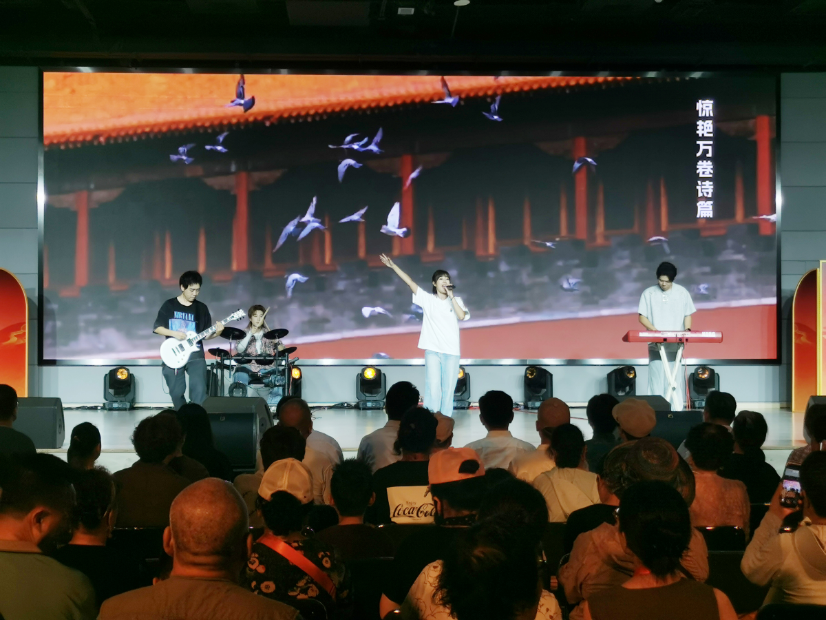 隨後現場演出在青年樂隊《金色的屋簷》的歌聲中拉開帷幕。演出共分為“軸啟新聲”“文脈相承”“和鳴未來”三個篇章,通過多種表演形式,在北京中軸線申遺成功一周年這一時間節點上,多層次地展現了北京中軸線的宏偉景觀和深邃的歷史文化底蘊。
