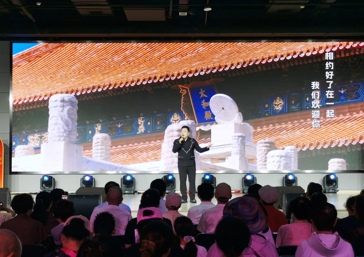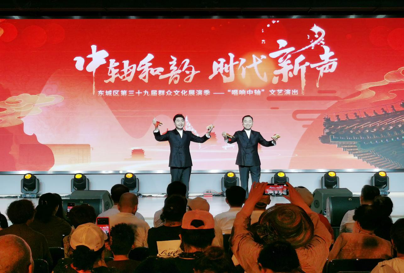 “和煦中庸”的傳統理念藏於北京中軸線佈局,“禮序乾坤”的文化密碼隱於宮闕規制。“禮”作為中軸文脈核心基因,早已融入中國人日常。舞蹈《禮儀之邦》舒展水袖模擬中軸對稱之美,融入舉手投足間的禮儀動作讓千年“禮”文化具象化。獨唱《北京歡迎你》借助熟悉的旋律,傳遞出北京的包容與熱情,歌聲裏有東城作為京城文脈核心的厚重,更有它向八方來客敞開懷抱的親切。曹燦藝術團表演的詩朗誦《中軸脊樑》,深情地講述了中軸線所承載的厚重歷史與光明未來。