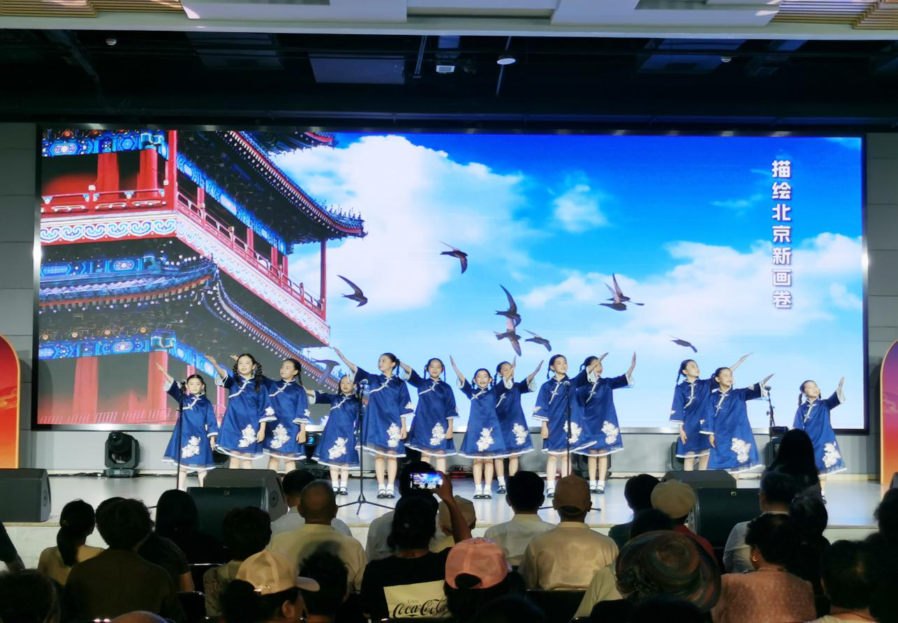 北京曲藝團快板書演員郭迎歡、孫國松帶來快板《最美北京中軸線》,用快板朗朗上口的韻文體形式,介紹北京中軸線上的美景,細數了縱貫古都7.8公里的“脊樑”上的絕美建築,生動地展現了中軸線的獨特魅力;北京市東城區少年宮合唱團的小朋友們天籟般的童音帶來歌曲《北京雨燕》,聽北京雨燕訴說中軸線上時代變遷,以清澈純淨的歌聲展望文化傳承的美好前景;舞蹈《墨舞》以身體為筆,巧妙勾勒出中軸線的歷史積澱與時代變遷,墨色裏藏著七百年的故事,舞步中躍動著新時代的節拍,傳統與現代和鳴共生;演出最後在東城區文化館鐘聲華風合唱團帶來的“唱響中軸”群眾文化活動原創主題曲《唱響中軸》中圓滿落幕,恢弘的旋律勾勒出中軸線的壯美輪廓,為整場演出畫上了完美的句號。