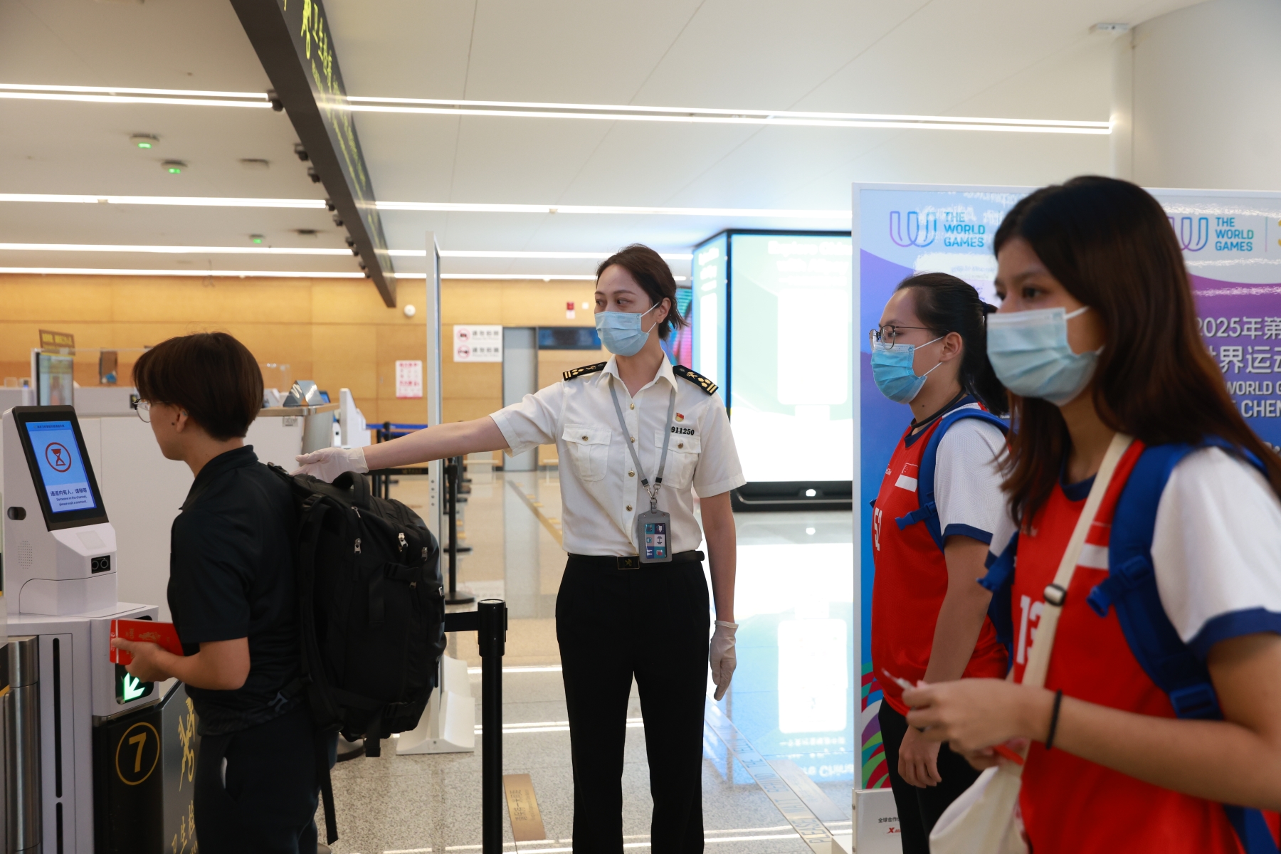 “我們為賽事人員申請了憑世運會邀請函免填外國人入境卡、免採生物指紋信息的便利措施。”四川邊檢總站成都邊檢站執勤一隊副隊長晉斐介紹,目前已與承運航空公司實現信息共享,提前獲悉參賽人員動態,做到即來即檢。口岸現場還配備了能翻譯60多種語言的智能翻譯機,確保參賽人員入境交流無障礙。