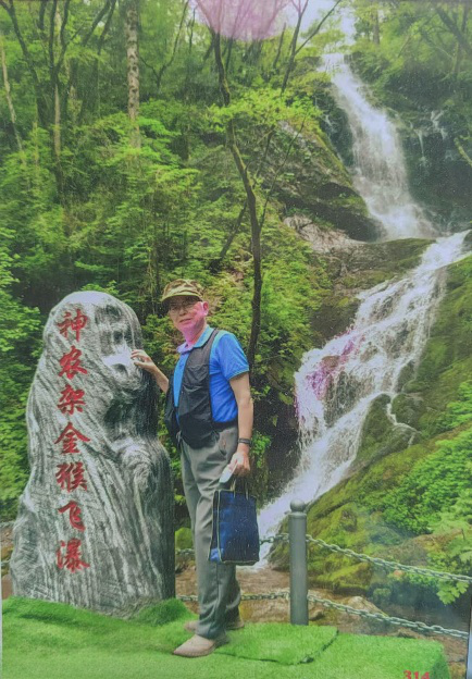 第二天上午,我們先是遊玩了以奇橋、奇潭、奇瀑聞名的天生橋景區。在這裏,我看到那座天然形成的石橋橫跨兩山之間,橋洞下溪水潺潺。我落在隊伍最後,手指撫過潮濕的岩壁,突然觸到一些凹凸的痕跡——是古代巴人留下的岩畫!那些看似簡樸的線條勾勒出狩獵場景,與今天我們這幫遊客高舉的手機相機形成荒誕對比,真令人感慨不已。接著,我們又參觀瞻仰了神農架地標性的景點炎帝神農氏祭壇。通往山頂的祭壇,要步行一段由9級、72級、63級、54級、42級、3級,共六個平臺243個石階組成的山路。在熱辣辣的陽光下走這段路還是蠻夠嗆的,所以我們團隊中最終到達祭壇前的,也就10位不到退休不久或最多退休10年左右的同伴。神農氏像是座高21米,寬35米的巨型牛首人身雕像。面對傳說中的老祖宗神像,大家不由得肅然起敬,情不自禁的雙手合十默默的禱告了起來。我看到,祭壇前還有一位鄰團的白髮蒼蒼的老者,居然行起了三跪九叩的大禮,真令眾人感慨不已。