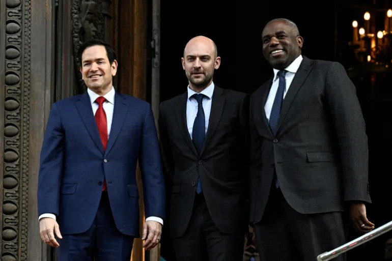 美國國務卿馬爾科·盧比奧、法國歐洲和外交部長讓-諾埃爾·巴羅和英國外交大臣戴維·拉米合影(路透社)