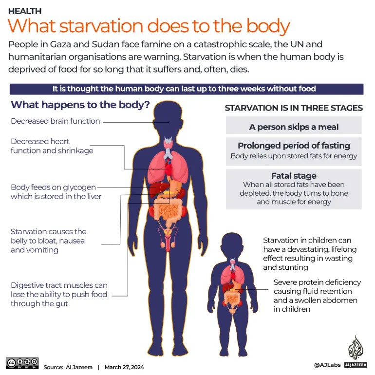 聯合國和人道主義組織警告稱,加薩和蘇丹人民面臨災難性的飢荒。飢餓是指人體長期缺乏食物,導致身體痛苦不堪,甚至死亡(半島電視台)