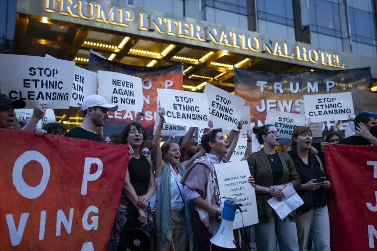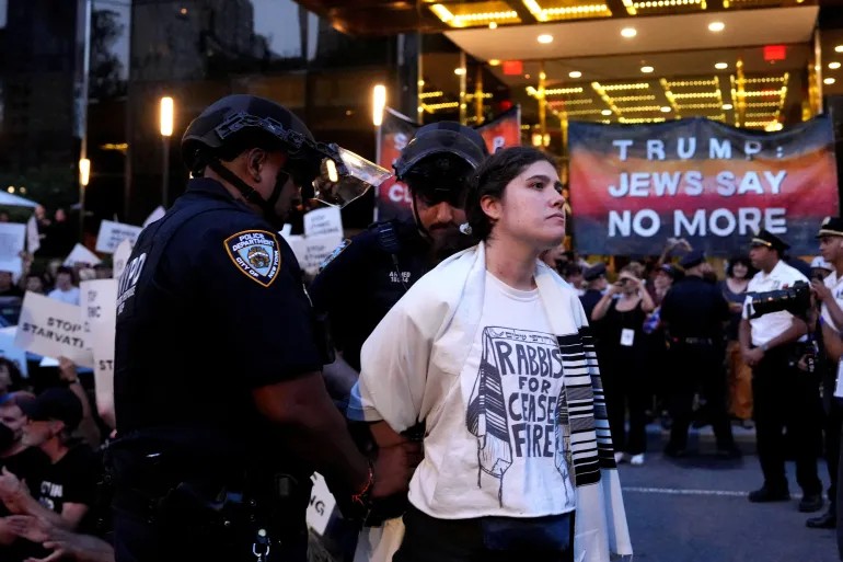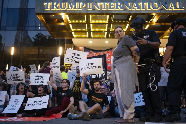 圖:猶太活動人士在紐約川普飯店外抗議加薩飢荒
