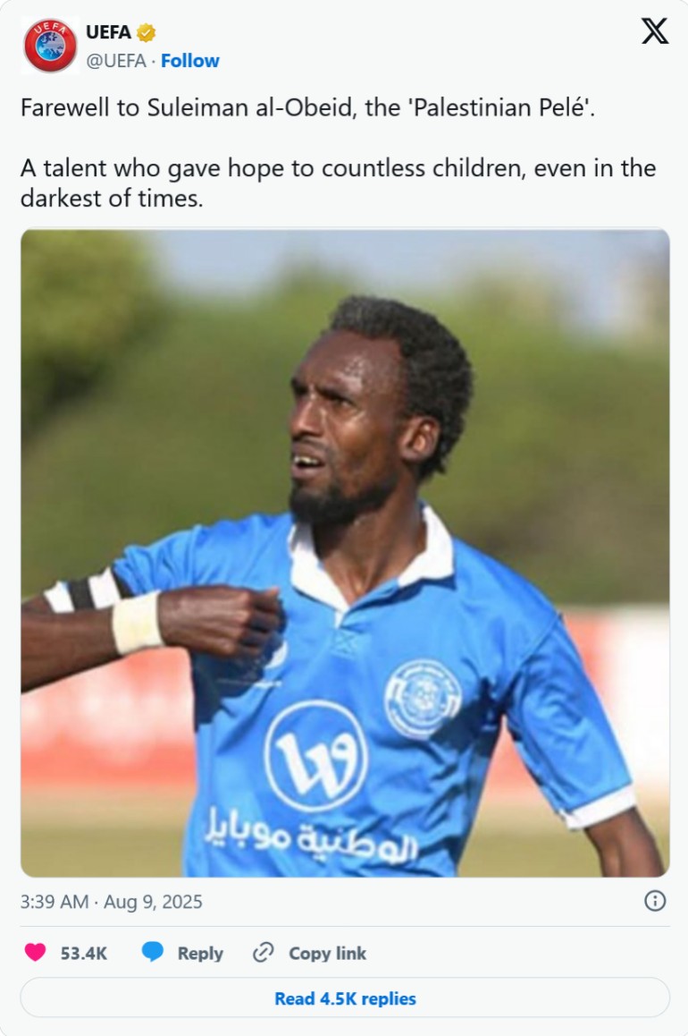 歐洲足總向前巴勒斯坦國家隊球員蘇萊曼·奧貝德致敬。他週三在加薩等待糧食援助時遭以色列襲擊身亡。