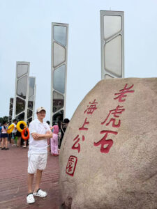 藝術館的斑斕光影尚在心頭縈繞,李鵬先生複引我探訪近旁沉澱著歷史風煙的秦皇遺址。漫步於這片承載著千古帝王東巡足跡的土地,夯土的台基靜默無言,仿佛低語著歲月長河中權力與野心的潮起潮落,令人頓感個體於時空維度下的渺小與須臾。轉至老虎石公園,那塊傳說中秦皇鞭海所遺、形如伏虎的巨礁,經千年浪濤的沖刷與打磨,依舊雄踞於碧波之畔。聆聽著海浪拍擊礁石、如虎嘯龍吟般的磅礴迴響,那關於自然偉力與時間韌性的古老傳說,更添幾分山海相依、剛柔相濟的生命況味。