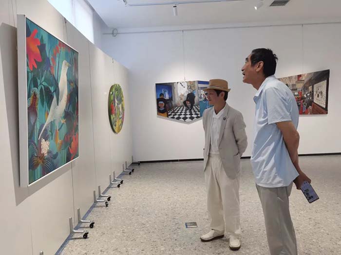 8月22日下午,陽光格外燦爛,仿佛為這場重逢鍍上了金光。在嶄新的“東亞·香譽藝術館”——這座據說為迎接此次中新藝術聯展而特意在一個月內緊鑼密鼓裝修落成的雅致空間裏,翟翔先生早已帶著真誠的笑容恭候我們的到來。李鵬先生體貼地陪伴在側,這份無聲的支持,讓初愈的我倍感安心與溫暖。站在宗元先生與翟翔先生精心組織的中新藝術家聯展現場,凝視著水墨的氤氳與油彩的濃烈交融,感受東方寫意與西方抽象的碰撞激蕩,那一刻,仿佛碣石山與渤海千年凝望的沉默被打破——山不動,海永恆,而藝術,正是那溝通天地的精妙語言。這場不期而遇、且在特意籌備的空間中展開的藝術盛宴,是病癒後精神世界迎來的第一道強光。午後的陽光透過藝術館的玻璃,灑在斑斕的畫作上,也灑進我的心田,它照亮了遠方,也印證了生命在低谷之後,自有其向上攀援、追求精神豐盈的頑強本能。