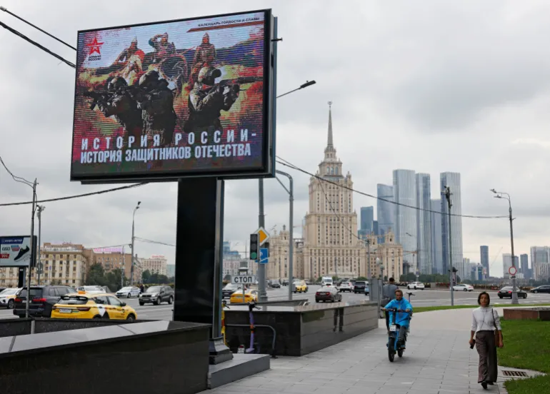2025年8月11日,莫斯科的人們走過一面支持俄羅斯軍隊的橫幅——上面寫著:「俄羅斯的歷史是保衛祖國者的歷史」 (路透社)