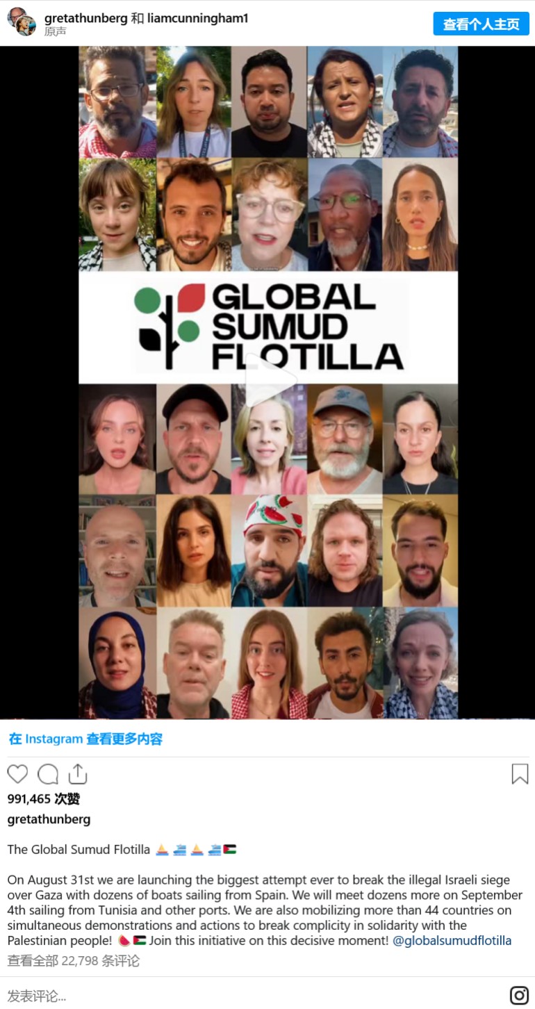 瑞典活动家格蕾塔·通贝里是“全球萨穆德船队”(Global Sumud Flotilla)的指导委员会成员,她将随船前往该船队,她表示,“全球萨穆德船队将是有史以来打破以色列对加沙非法封锁的最大规模尝试”。