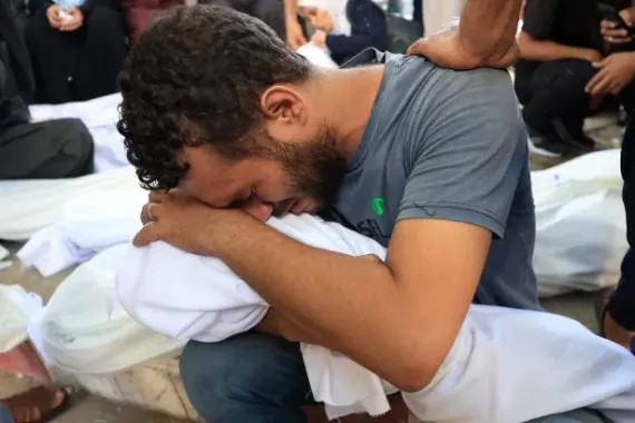 2025年8月29日,在加沙城希法医院,一名男子在巴勒斯坦人葬礼上哀悼一名被裹尸布包裹的儿童遗体,据医护人员称,该儿童死于夜间对帐篷的袭击。