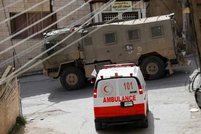 2024年3月30日,在以色列占领的西岸图巴斯,一辆巴勒斯坦红新月会救护车在以色列军车附近。