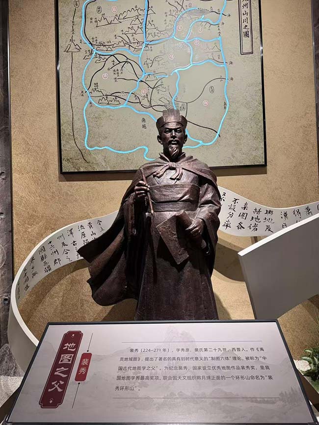 在裴氏家訓展館內,江坤被一尊雕像所吸引。講解員告訴大家這位是地球之父:”裴秀是1700多年前的先哲,他以進取的勇氣、刻苦的鑽研、辛勤的勞動,創立了“製圖六體”的理論,這樣的發明創造實在非常了不起。