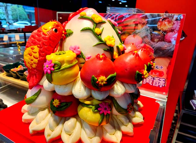 當天下午,來到聞喜縣非遺保護中心。花饃製作的婚慶系列,祝壽系列等主題花饃。麵團在技藝人手中仿佛被施了魔法,不一會兒就變成栩栩如生的各類造型。