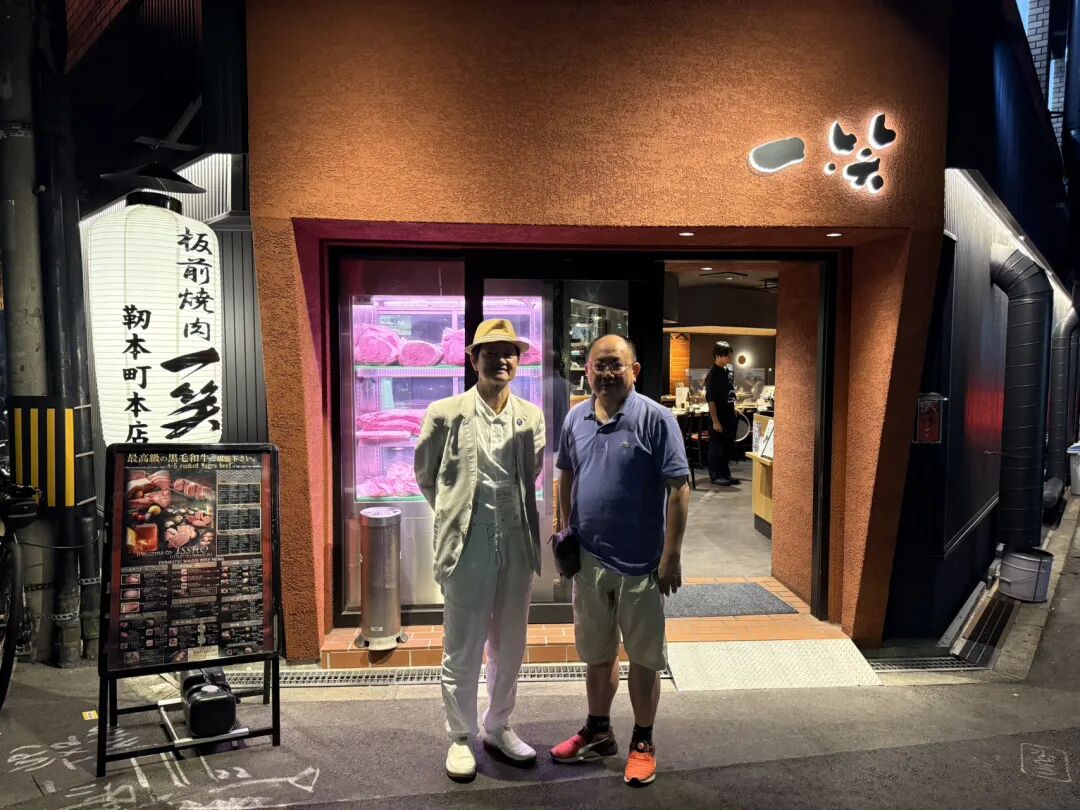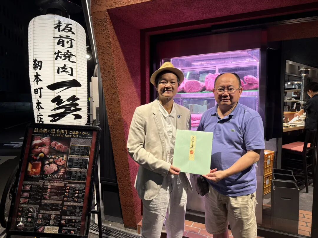 暮霞煥彩,映照大阪城郭。餘步出世博園囿,驅車赴約,得晤鄉親何玲青先生。先生祖籍粵東梅縣,早年負笈東瀛,僑寓斯土,今為儒商翹楚,身兼全日本華人書法家協會常務理事、日本廣東總商會會長、関西中華総商會名譽會長諸職。先生雅意拳拳,特於大阪府名庖設席,以炙肉之珍饈款待,聊表鄉誼。餘忝任「2025國際城市文化論壇—走進大阪」主席一職,盛會期於十月四日假大阪歷史博物館舉行。何先生膺任執行主席,席間吾等共議論壇籌辦事宜,務求周詳,期使諸策得以切實施行。先生風雅,惠贈李可染先生哲嗣李庚君畫作一幀,囑餘存念。餘亦奉上故園嘉茗,以酬雅意,略寄桑梓之情。