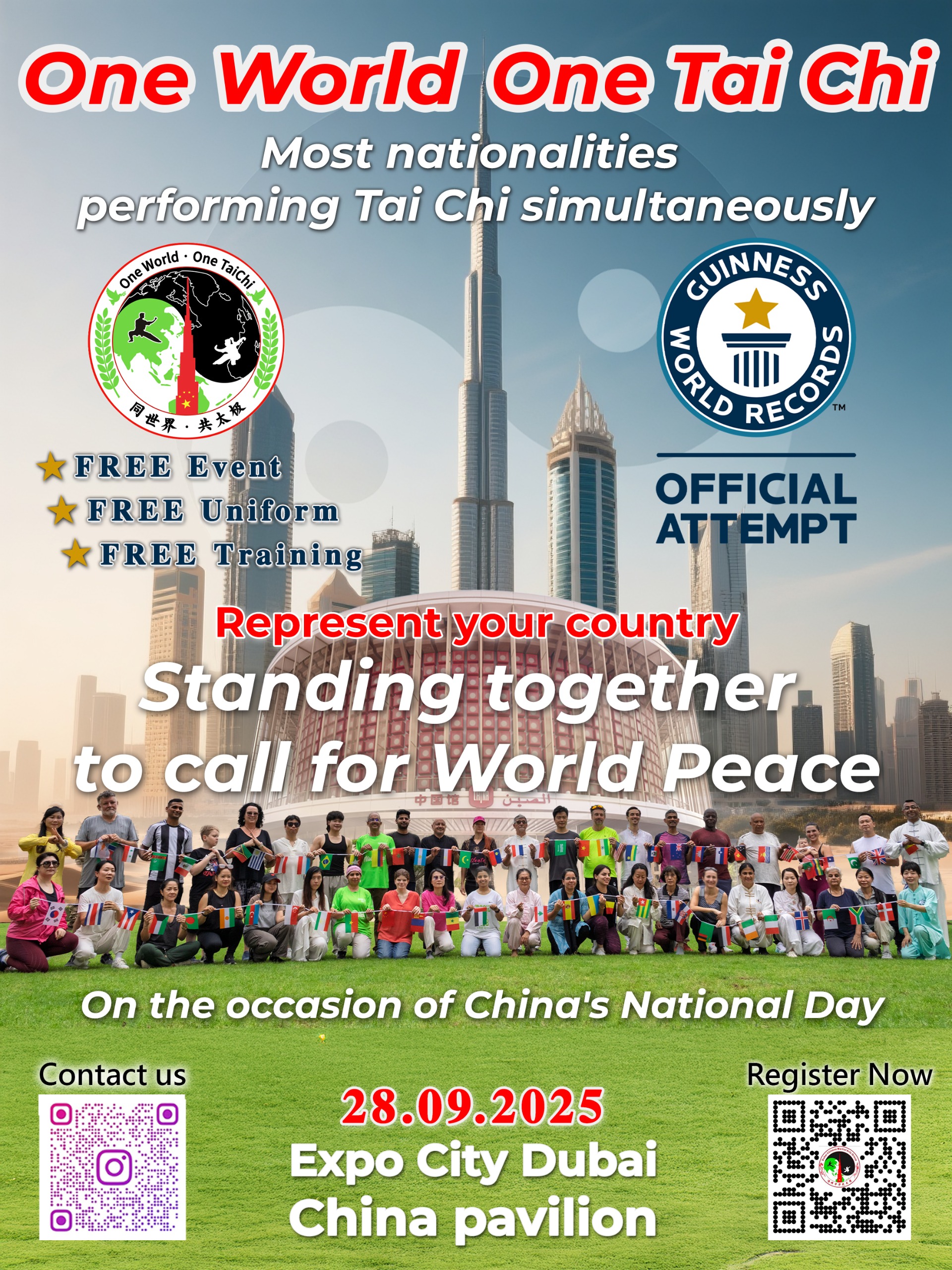 We sincerely invite you to represent your country in a historic World Record challenge – “Most Nationalities Performing Tai Chi Simultaneously”. TaiChi embodies harmony and balance,Let’s celebrating unity, peace, and cultural diversity through TaiChi’s graceful movements!