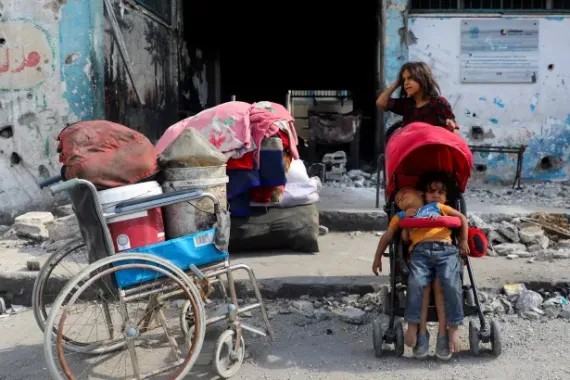 2025年9月19日,在以色列军队下令加沙城居民向南撤离后,流离失所的巴勒斯坦人正准备撤离,一名女孩站在一辆婴儿车旁,车里坐着两名儿童