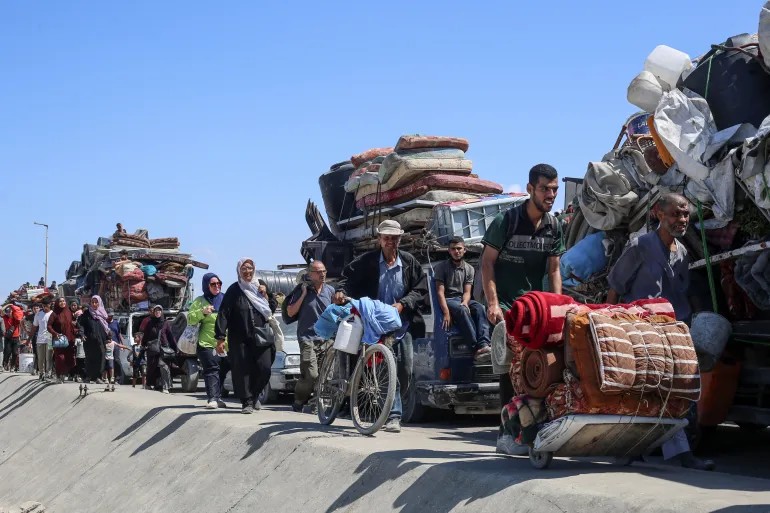 加沙城巴勒斯坦民众携带财物向南迁移,行进至加沙地带中部努赛赖特难民营附近沿海公路,摄于2025年9月19日 (法国媒体)