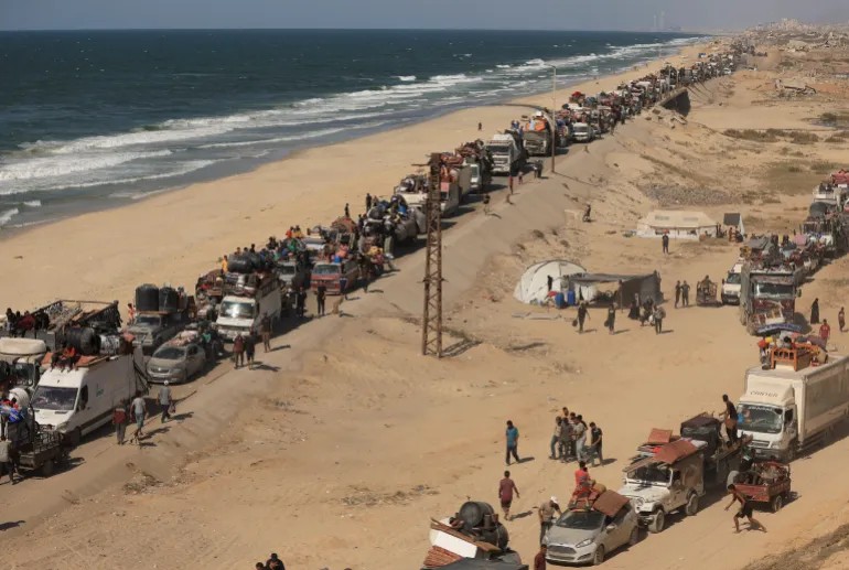 这是加沙的沿海公路,目前被视为逃离加沙城、面临轰炸威胁的家庭的生命线。
