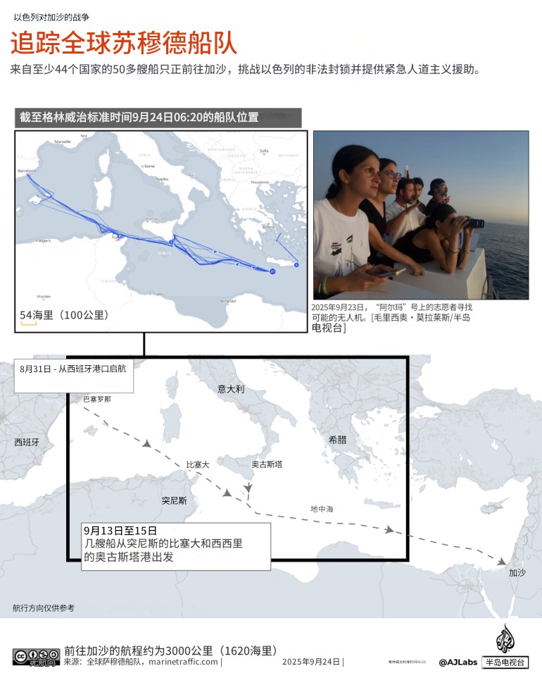 有超过50艘船只驶往加沙,这些船只途经克里特岛附近的希腊国际水域。他们希望此举能降低遭到以色列或其他任何方面袭击的可能性。