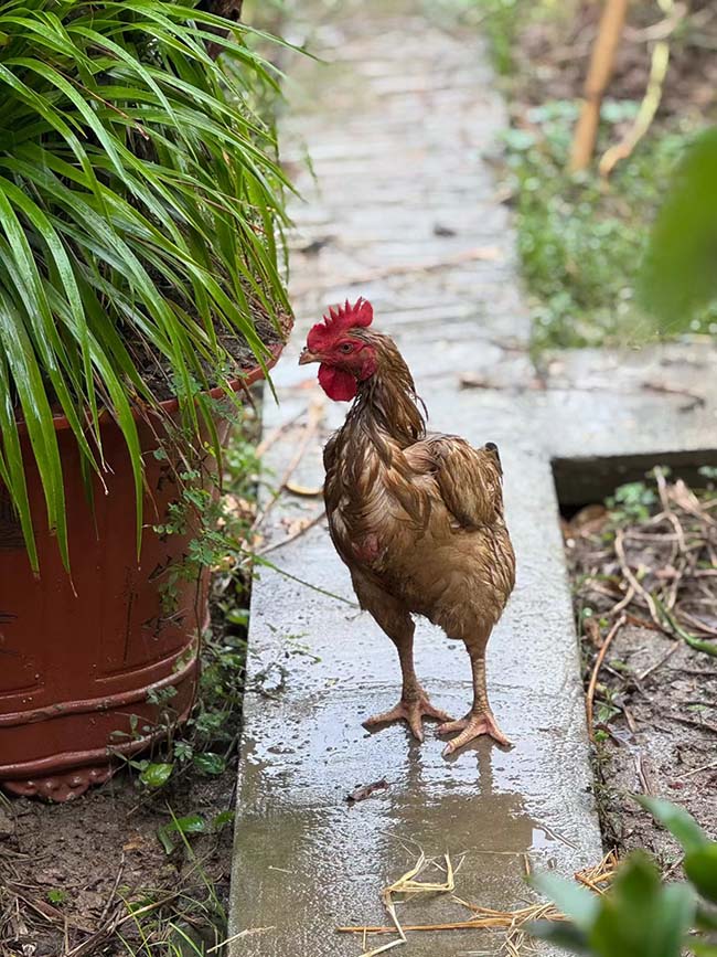 那幾只雞,怕是這狂亂樂章裏最從容的舞者了。它們一點兒也不懼,竟在風雨中“閒庭信步”起來。豆大的雨點砸在它們身上,羽毛緊貼著小小的身子,活脫脫成了幾只精濕的“落湯雞”。它們有的兀自低著頭,在積水的泥地上篤定地啄著什麼,仿佛不是在躲避風雨,而是在赴一場久違的沐浴盛會。那份旁若無人的安然,倒給這狂暴的天氣平添了幾分滑稽的禪意。