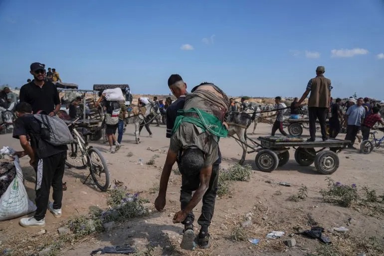 8月份,一名男孩在内扎里姆的一家由美国和以色列支持的加沙人道主义基金会运营的分发中心附近试图领取援助物资时,抬着一名男子的尸体 (美联社)