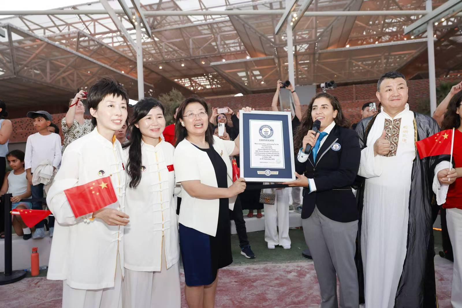 (中華新聞通訊社/中華時報 阿聯酋訊 記者 劉珊珊)9月28日,由阿聯酋山西商會暨同鄉會主辦,阿聯酋江西商會暨同鄉會、阿聯酋溫超集合團等機構聯合協辦,並在中國駐迪拜總領事館及多家中外文化機構支持下,“同世界,共太極”大型文化交流 活動在迪拜世博城中阿經貿交流中心成功舉辦。來自77個國家的180名太極拳愛好者同場習練,共同創造了“最多國籍習練者共打太極”的吉尼斯世界紀錄,以一場跨越國界的文化盛事,向中華人民共和國成立76周年獻上深情祝福。
