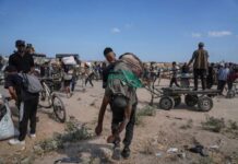 袭击发生之际,逃离加沙城猛烈轰炸的流离失所的巴勒斯坦人继续向南寻求避难。