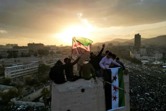 大馬士革一所男子高中的學生,興高采烈在校內空地等待著,並在校務秘書納瑟(Raed Nasser)掛上新政權採用的旗幟時鼓掌喝采。