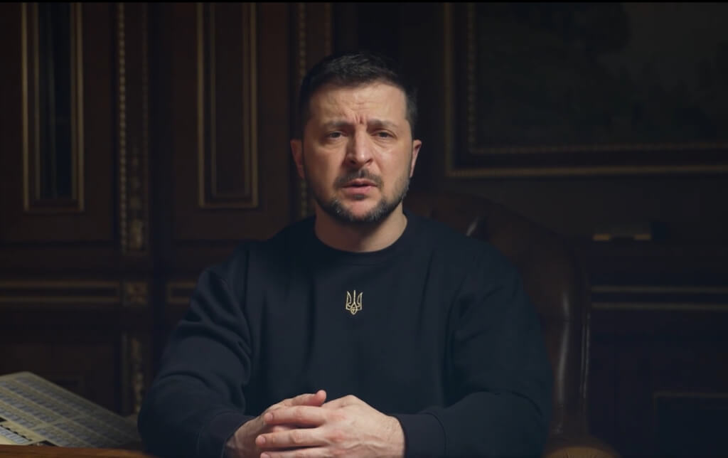 澤倫斯基坐在辦公桌前,回憶起1年前全球因俄羅斯全面入侵烏克蘭而感到震驚時,他如何對烏克蘭人民發表談話。