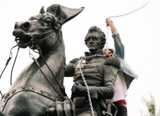 美國一座哥倫布雕像被示威者推倒推落河灣