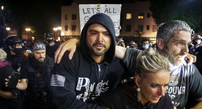 (中华时报/华闻社9月1日华盛顿电)社交媒体流传的视频显示,坐小型卡车进入波特兰市的人向反对特朗普的示威者投掷油漆球、喷洒化学物,后者则向卡车投掷物品。疑似摄于周六夜的一段视频显示,一群人在一个车库外的街道上,枪声突然响起,一人应声倒地。此人戴着一顶有“爱国者祈祷”右翼组织标志的帽子。该组织创办人吉布森(Joey Gibson)表示不能透露更多细节,但确认这名中弹身亡者是其好友,也是该组织的支持者。