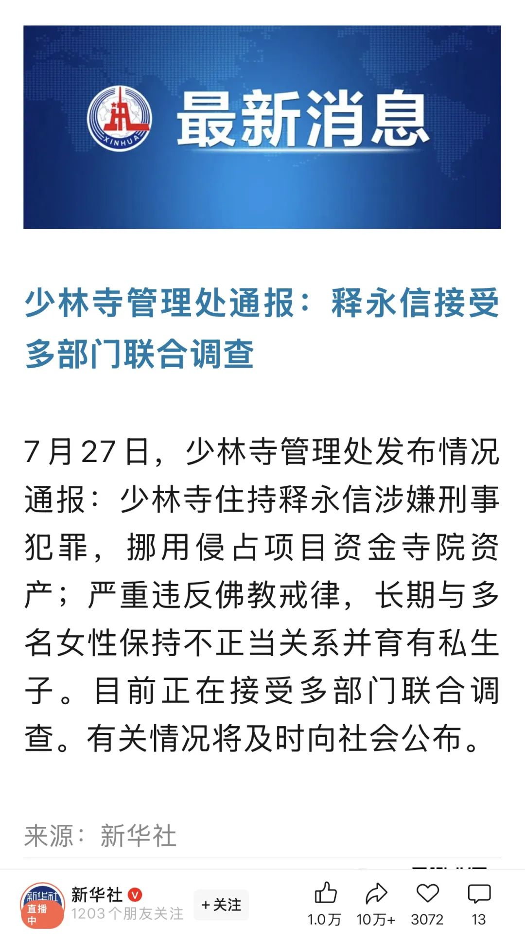 少林寺管理處關於釋永信涉嫌刑事犯罪與違反戒律的...