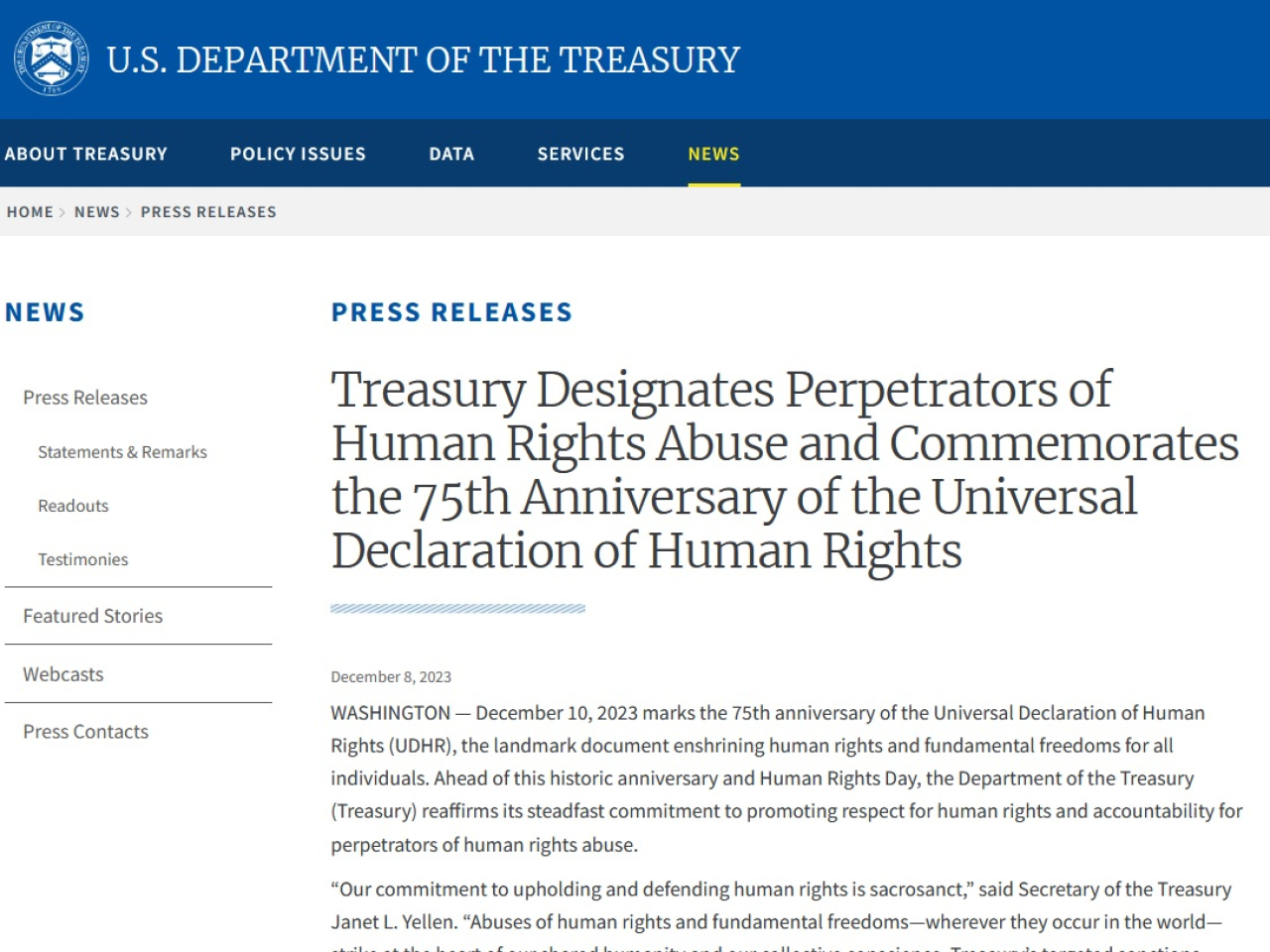 美國財政部長葉倫(Janet Yellen)透過新聞稿表示,對維護和捍衛人權的承諾神聖不可侵犯。財政部今天與過去一年的制裁,凸顯致力於推動對侵犯人權行為的問責,並捍衛美國金融體系免受這些犯下惡劣行為者影響。
