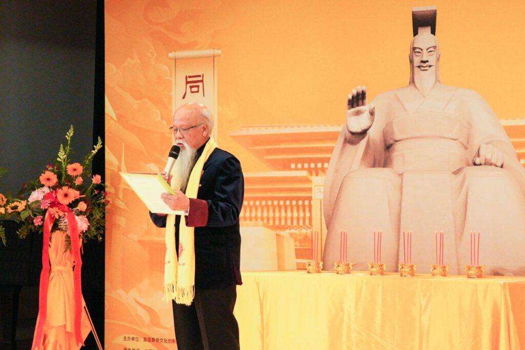 恭讀拜文:文以載道,字字千鈞。大英帝國員佐勳章獲得者(MBE),劍橋華人聯誼會創始會長、中文學校管理委員會創始人、劍橋中華龍舟會主席李炳南先生率眾嘉賓恭讀拜文。字句鏗鏘回顧黃帝功績,祈願“四海同心,九州共榮”,文成瞬間掌聲雷動。
