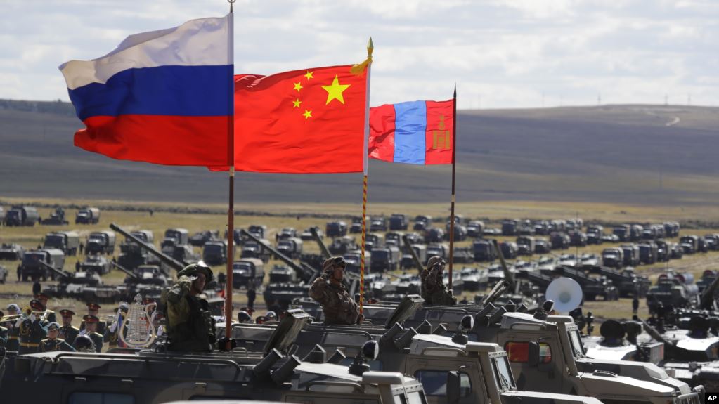 (资料照)2018年俄罗斯、中国以及蒙古参加联合军演。(AP Photo/Sergei Grits)