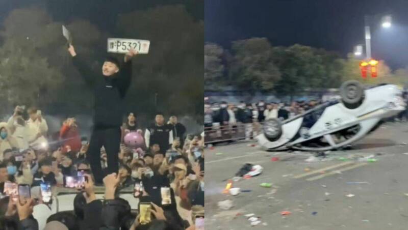 河南群眾砸警車狂歡,疑不滿煙花管理規定。(擷取自影片)