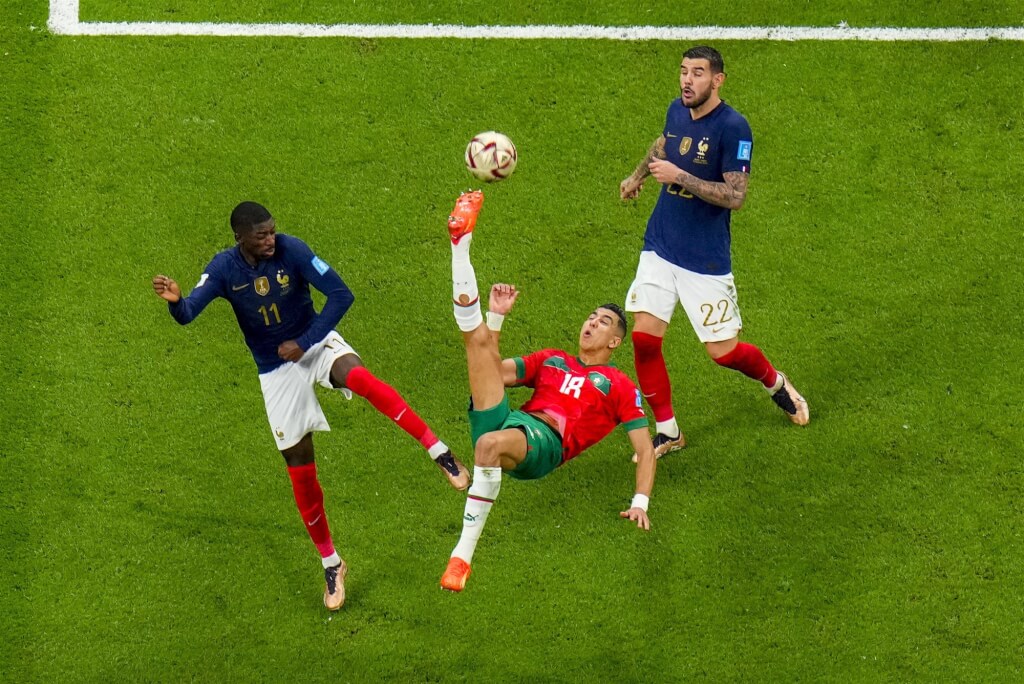 在上半場第44分鐘左右,摩洛哥後衛亞米格(Jawad El Yamiq)在法國球門前倒掛金鉤,但球擊中左邊門柱,錯失追平機會。